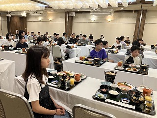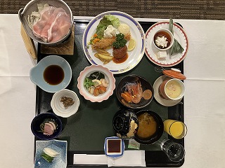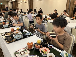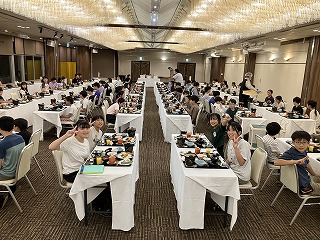 修学旅行の夕食は、子どもたちが楽しみにしていたお膳料理でした。ホテルのスタッフさんのおもてなしに緊張しながらも、色とりどりの豪華な食事がずらりと並んでいて、みんなの顔は笑顔でいっぱいになりました。