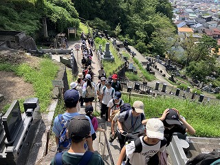 飯盛山は、戊辰戦争で活躍した白虎隊の少年たちが自刃した場所として知られています。生徒たちは、ガイドさんの説明を真剣に聞きながら、白虎隊のお墓や、鶴ヶ城を望んで自刃したとされる場所を見学しました。