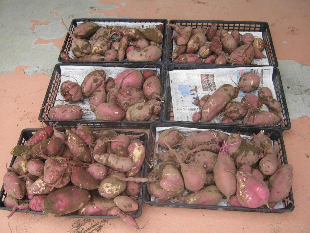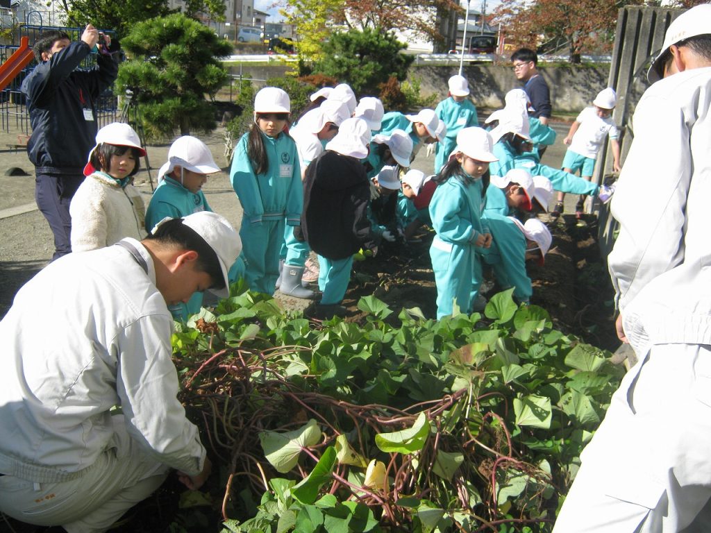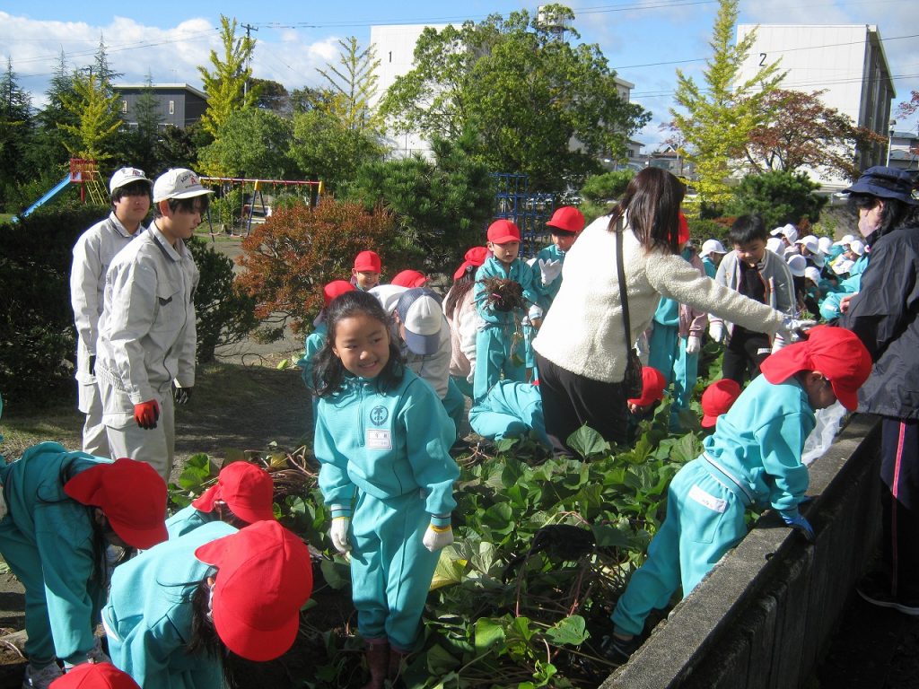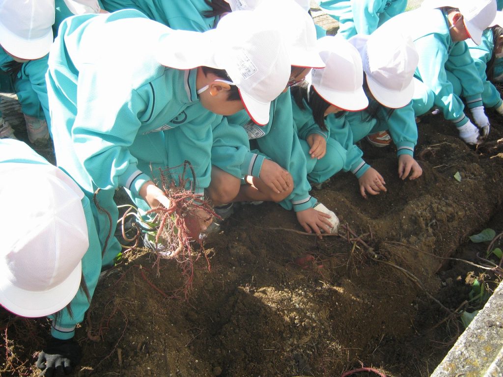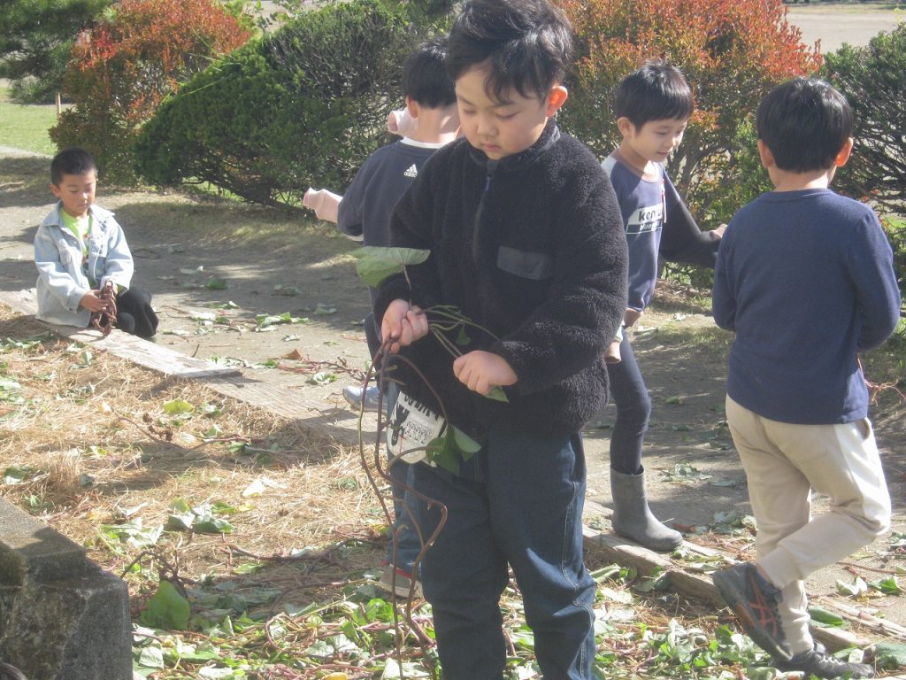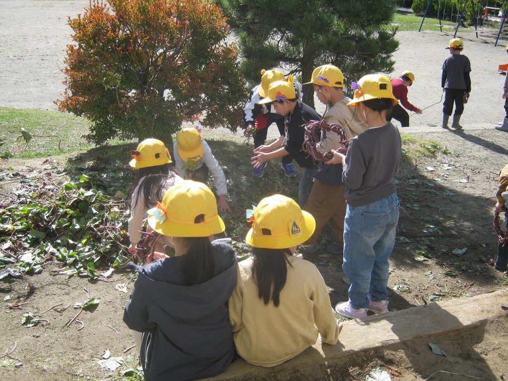 5月に植えたサツマイモの苗。今度も小牛田農林学校の生徒さんにお手伝いしてもらいながら収穫しました。ツルを外し、土を掘っていくとたくさんのサツマイモを彫り上げることができました。1年生のお顔よりも大きいサツマイモも収穫できました。掘ったおイモは給食で調理してもらいます。どんなメニューになるか今からとても楽しみです。外したサツマイモのツルは葉っぱを取ってリースにしました。今度飾り付けをする予定です。