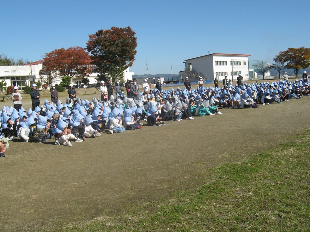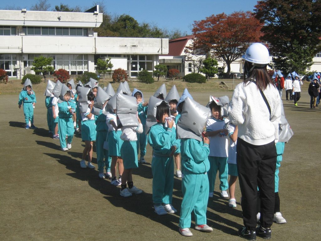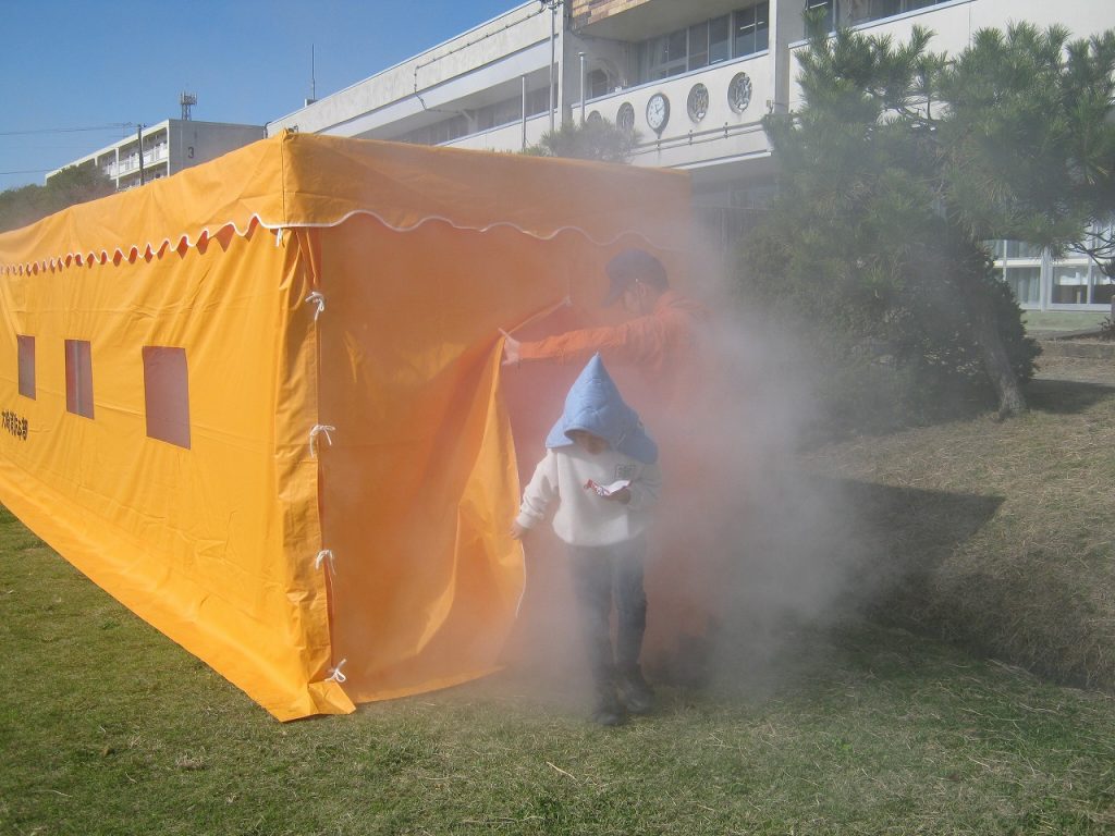 子供たちは、自分の命を守る行動を真剣に行っていました。消防の方には訓練の様子を見て、とてもすばらしかったとお褒めの言葉をいただきました。その後、5年生が煙中体験を行いました。煙の中では前が見えないので、身を低くし、口や鼻から吸い込まないように工夫して体験していました。
