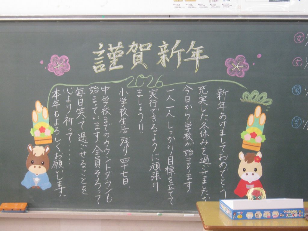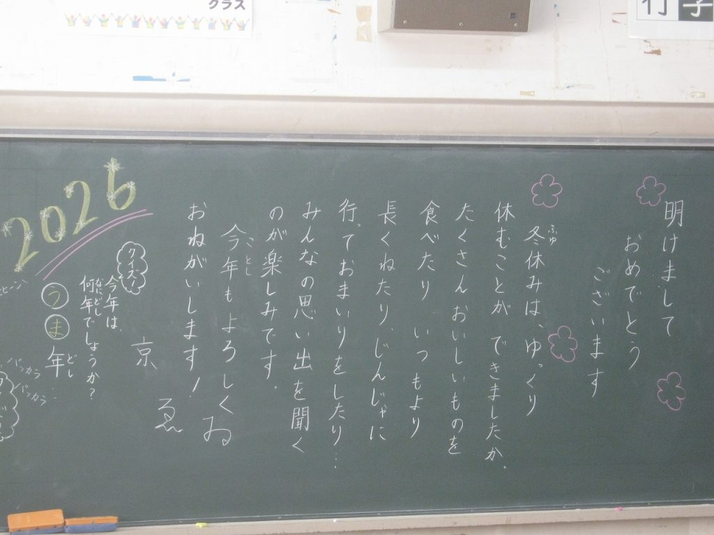 1月8日。冬休みが明け学校に子供たちが帰ってきました。今朝も校門前に立っていると「おはようございます。」の挨拶と共に「あけましておめでとうございます。今年もよろしくお願いします。」とさわやかに挨拶を返してくれました。冬休み中にインフルエンザ等にり患した子も思ったよりも少なく、元気に過ごした様子がうかがえほっとしました。