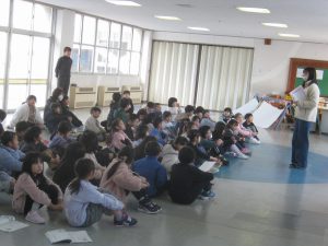 そこで、冬休み明け朝会は全校児童が体育館に集まって行いました。朝会に臨む態度も休み明けとは思えないほど立派です。校長からは、「新しい年を迎え、さらに成長していきましょう。」「けんかや失敗もあるかもしれないけれど、そこから成長につなげていけるようにしていきましょう。」「見方をかえ、プラスに事をとらえられると豊かになる。笑顔でどんどん『福』を呼び込んでいきましょう。」と話がありました。