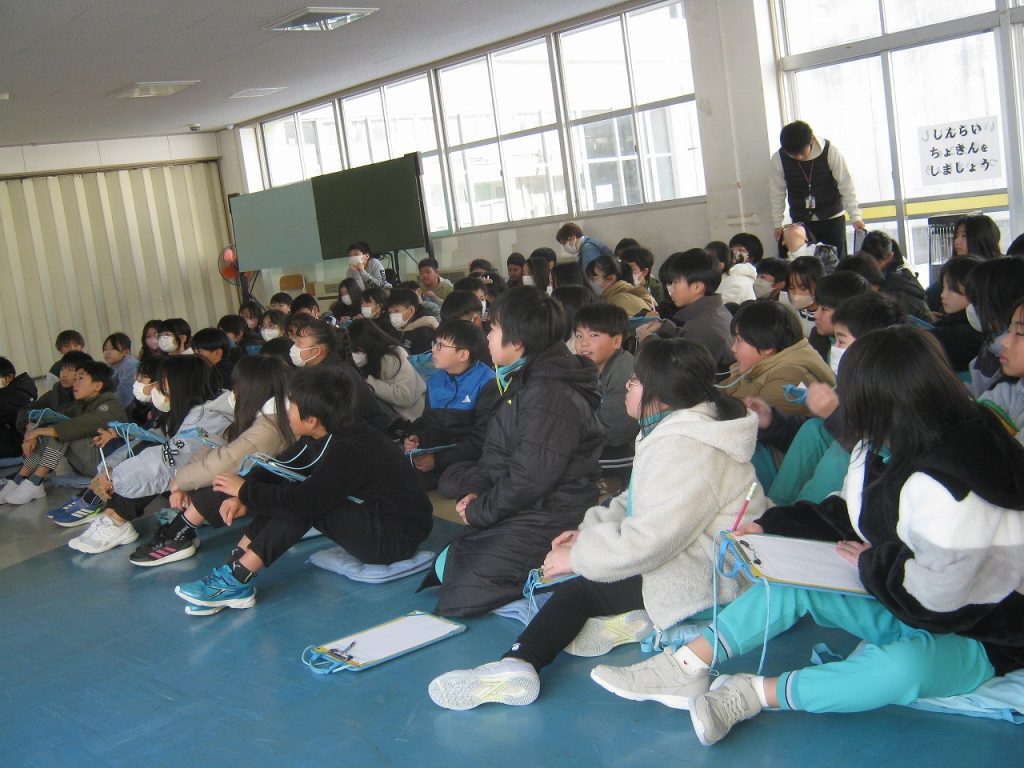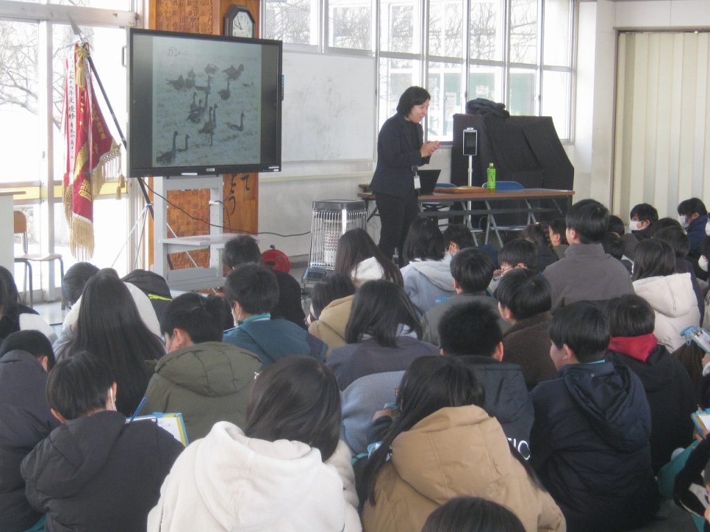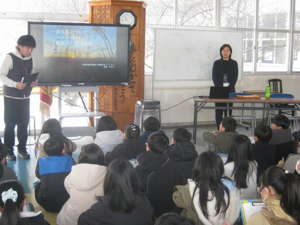 1月13日(火)5年生が総合的な学習で取り組む環境教育について出前授業を受けました。講師はNPO蕪栗ぬまっこくらぶの事務局長の高橋さんをお迎えして渡り鳥から見える環境についてお話をいただきました。とても分かりやすく、子供たちは一生懸命メモを取りながら、今後の学習課題について考えることができたようです。