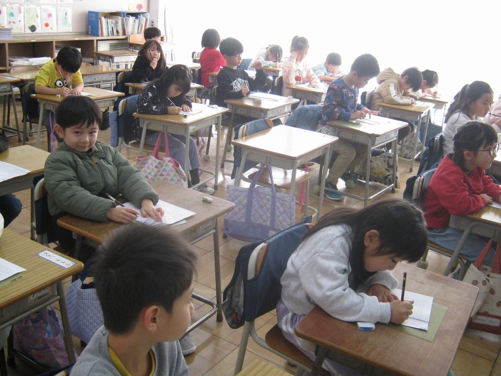 1月14日(水)教室を回ってみると、しっかりと学習に集中して取り組んでいる様子が見られました。1年生は書き方の練習に取り組んでいました。お手本を用紙の隣にしっかりと置き、細かいところもよく見て、手本の字に近付けようと頑張って書いている様子が見られました。