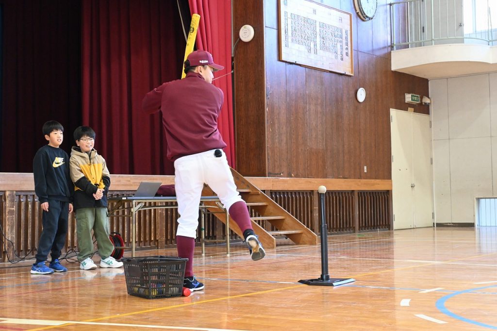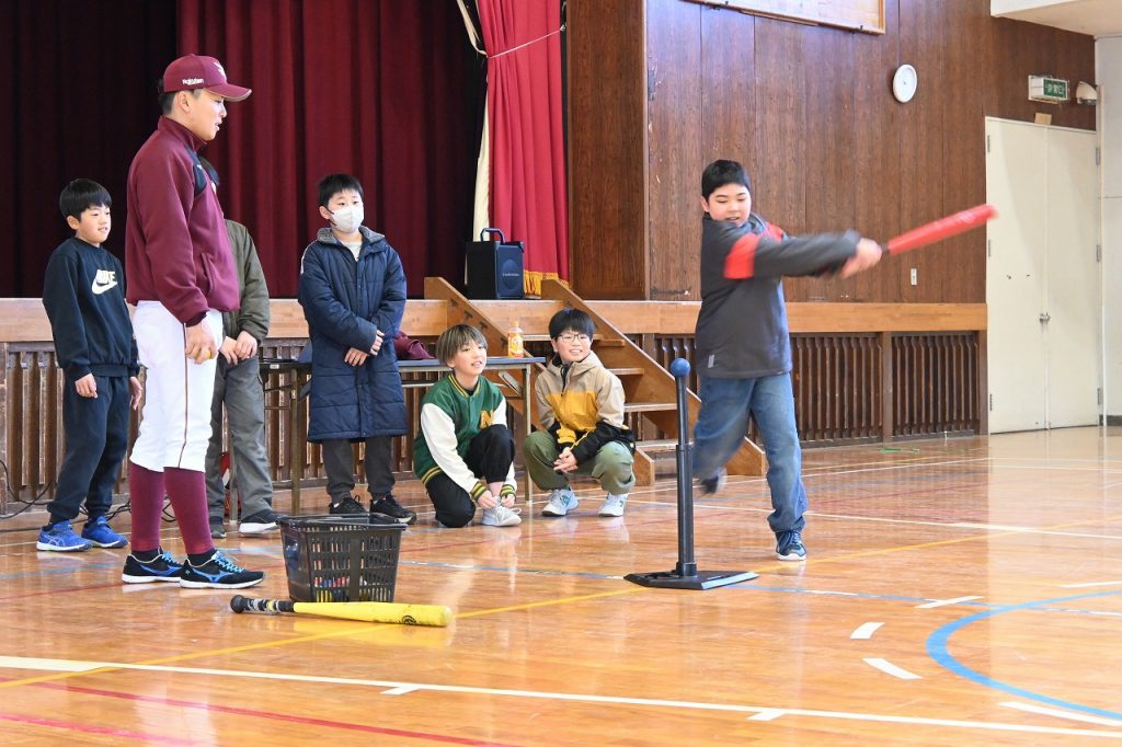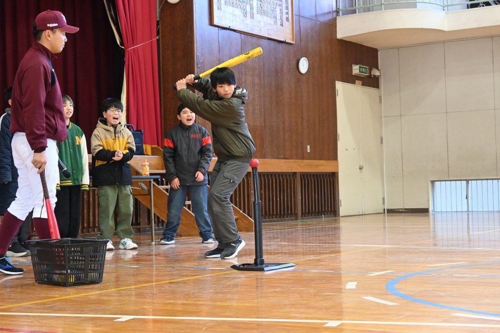 2月4日(水)東北楽天ゴールデンイーグルスのアカデミーコーチの高木 誠也コーチをお迎えして、5年生を対象に楽天未来塾を開催しました。志教育の一環で、なりたい自分になるためにどんなことが必要なのか、どんな思いが大切なのかを伝えていただきました。最初に室内でのバッティングにも挑戦し、心をつかまれ、話にも引き込まれていたようです。
