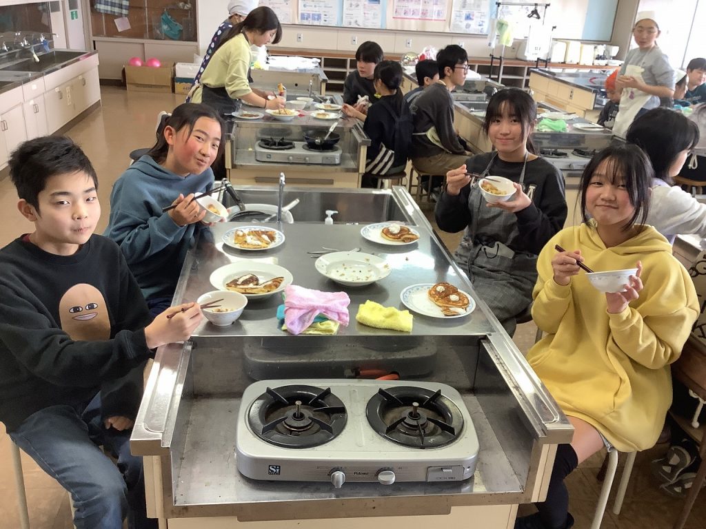 12日から16日の間6年生が家庭科で調理実習に取り組んでいます。12日は2組、13日は3組、そして16日は1組を予定しています。調理するものは、「ジャーマンポテト」と「ホットケーキ」です。包丁でジャガイモの皮をむいたり、玉ねぎを薄くスライスしたり、真剣に取り組んでいました。出来上がったものをみんなでおいしそうにいただいていました。