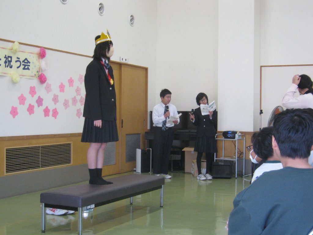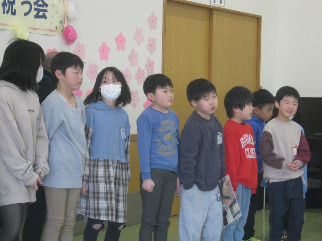 18日、青生コミュニティーセンターで美里町小・中学校特別支援学級の卒業・進級を祝う会がありました。美里中生が中心になって進行してくれました。各学校ごとに一年間の思い出を発表したり出し物をしたり、練習してきた成果を発揮していました。ゲーム「王様じゃんけん」では、みんなで楽しみました。