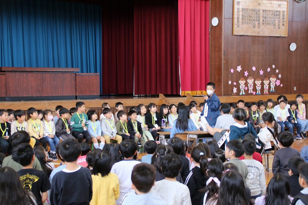 計画委員会が中心となって進行をします。 2年生がお迎えの言葉の担当です。学校のことを分かりやすく紹介しました。「運動会がありますよ」「国語のお勉強がありますよ」「計算ができるようになるよ」などなど担当ごとに実演しながら紹介しました。